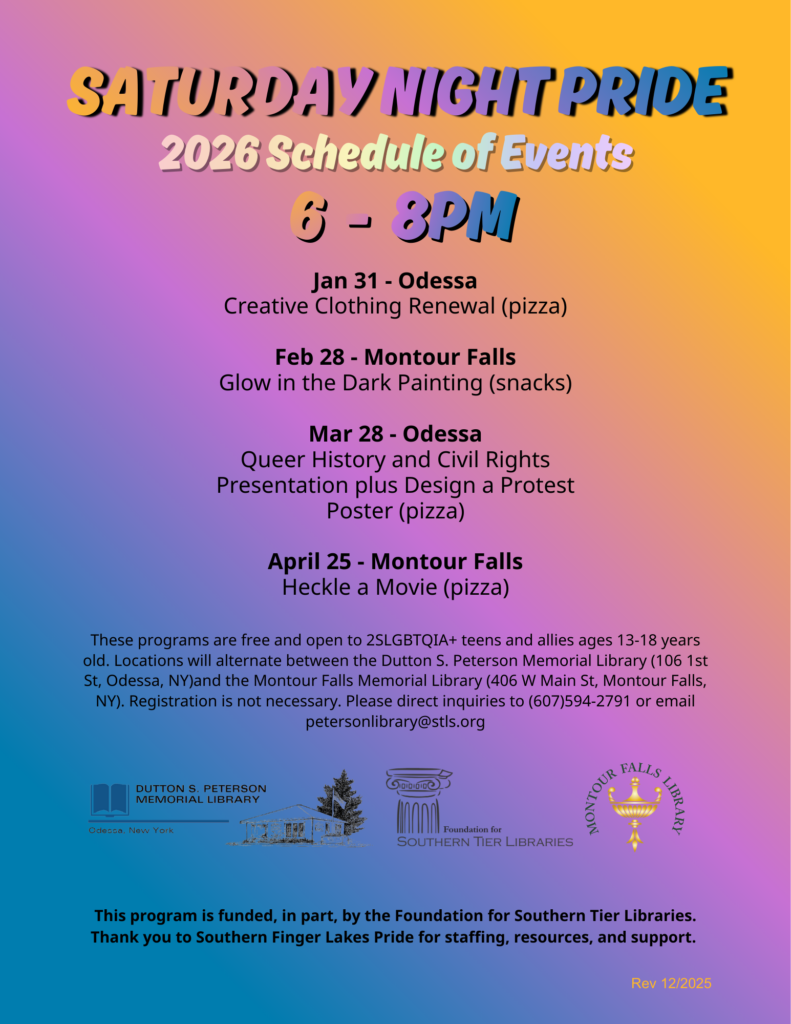 Montour Falls Library and Dutton S. Peterson Memorial Library are hosting Saturday Night PRIDE, a monthly social group for 2SLGBTQIA+ Youth and Allies ages 13-18. No registration is required.