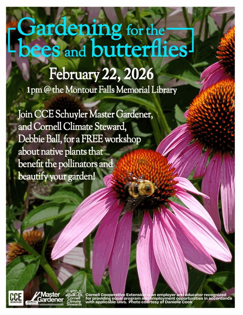 Join CCE Schuyler Master Gardener and Cornell Climate Steward, Debbie Ball, for a FREE workshop about native plants that benefit the pollinators and beautify your garden!