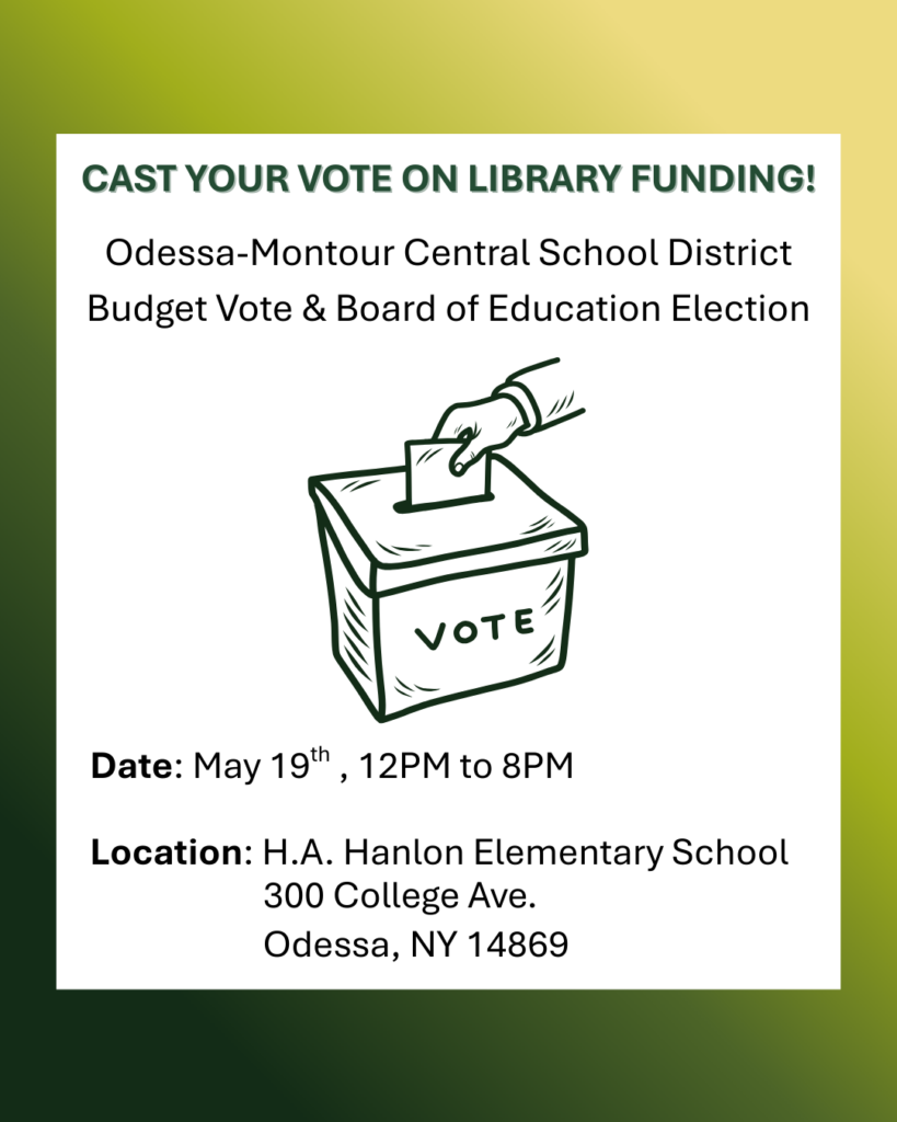 The budgets for the Montour Falls Memorial Library and Dutton S. Peterson Memorial Library (Odessa) are directly tied to the school district vote! Cast your vote on 3/19 at the H. A. Hanlon Elementary School, 300 College Ave in Odessa, NY 14869.